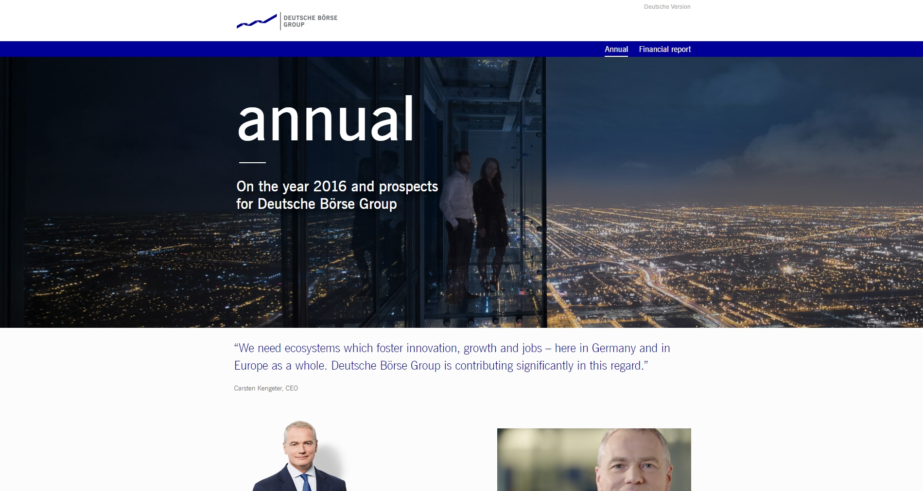 | Company/Agency Name: | Deutsche Börse Group / EQS Group AG | | Company/Agency Web Site: | deutsche-boerse.com/dbg-en/ / www.eqs.com/ | | Annual Revenue: | $1 - $10 billion | | Employee Base: | 1,000 - 10,000 employees | | Core Industry: | Financials — Capital Markets | | Type of Report: | Annual Report | | Title/Theme: | "On the year 2016 and prospects for Deutsche Börse Group" | | Industry Award Garnered: | Silver | | | | Judging Results | | First Impression: | | | Report Cover: | | | Letter to Shareholders: | | | Report Narrative: | | | Report Financials: | | | Creativity: | | | Message Clarity: | | | Information Accessibility: | | | Total Score: | |