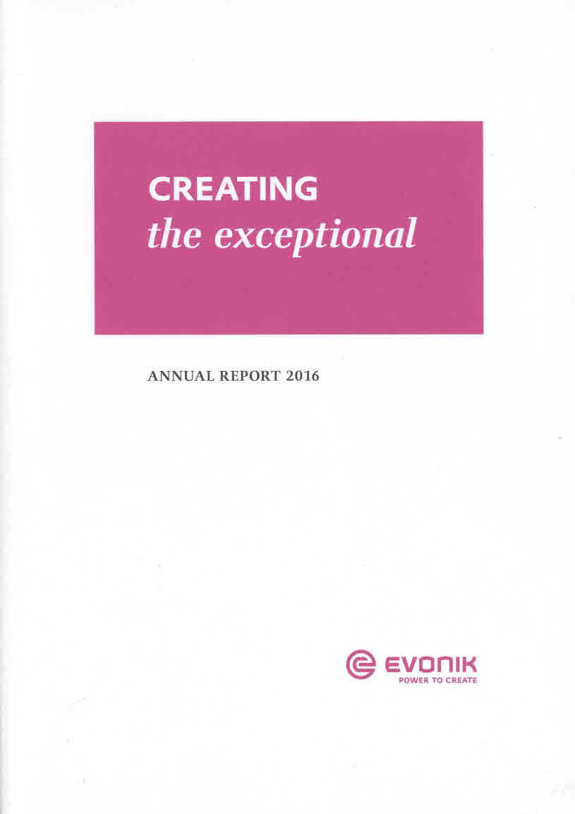 | Company/Agency Name: | Evonik Industries AG / BISSINGER[+] GmbH | | Company/Agency Web Site: | www.evonik.com / www.bissingerplus.de | | Annual Revenue: | $10+ billion | | Employee Base: | 10,000+ employees | | Core Industry: | Chemicals | | Type of Report: | Annual Report | | Title/Theme: | "Creating the exceptional" | | Industry Award Garnered: | Silver | | | | Judging Results | | First Impression: | | | Report Cover: | | | Letter to Shareholders: | | | Report Narrative: | | | Report Financials: | | | Creativity: | | | Message Clarity: | | | Information Accessibility: | | | Total Score: | |