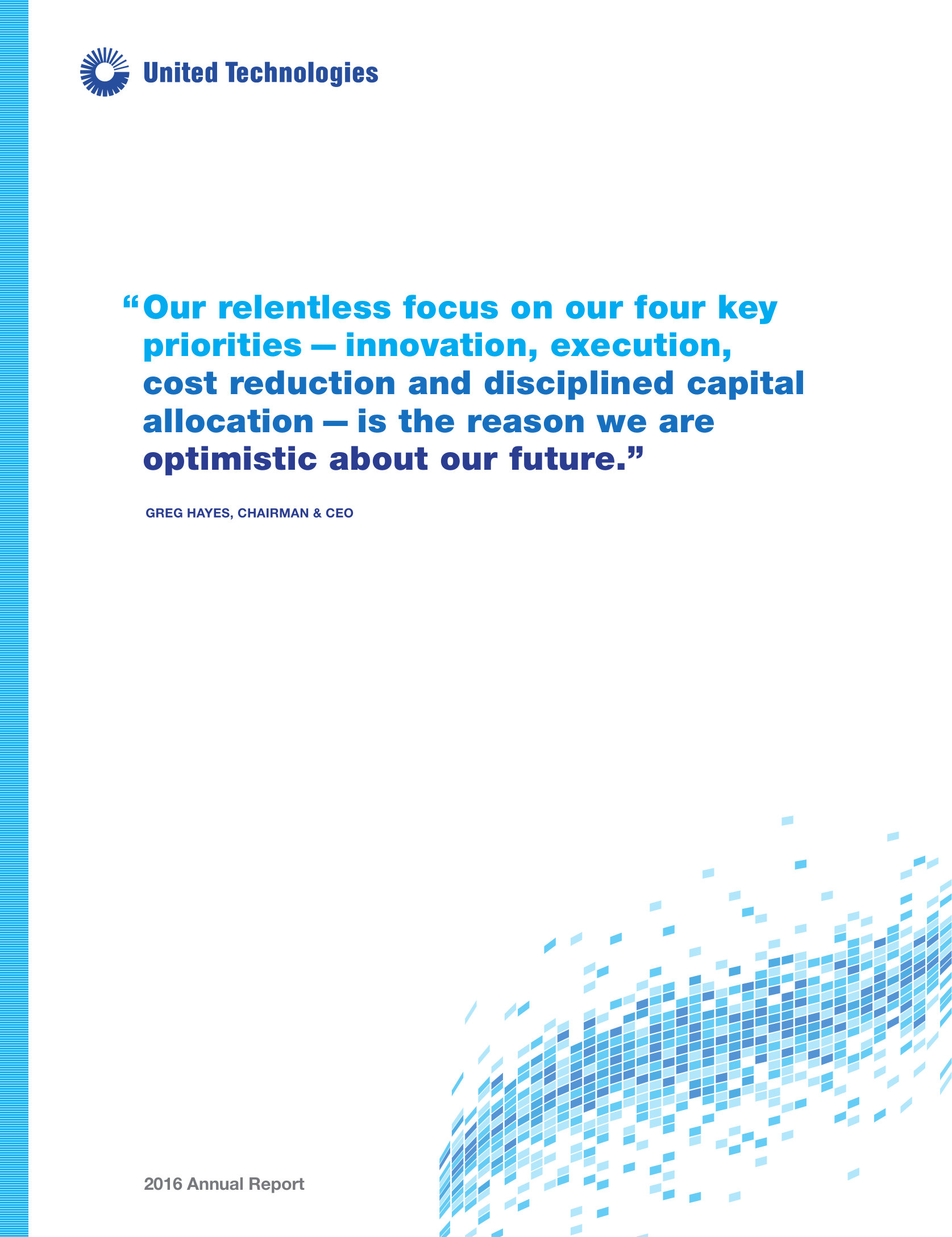 | Company/Agency Name: | United Technologies / Ideas On Purpose | | Company/Agency Web Site: | 2016ar.utc.com / www.ideasonpurpose.com | | Annual Revenue: | $10+ billion | | Employee Base: | 10,000+ employees | | Core Industry: | Conglomerates, Holding Cos., Divers. Invest. | | Type of Report: | Annual Report | | Title/Theme: | "Doing more, more to do." | | Regional Top 80 Rank: | 11 (Americas Region) | | Country-Based Honors: | Top 50 American Reports | | Industry Award Garnered: | Platinum | | Top 100 Worldwide Rank: | 28 | | | | Judging Results | | First Impression: | | | Report Cover: | | | Letter to Shareholders: | | | Report Narrative: | | | Report Financials: | | | Creativity: | | | Message Clarity: | | | Information Accessibility: | | | Total Score: | |