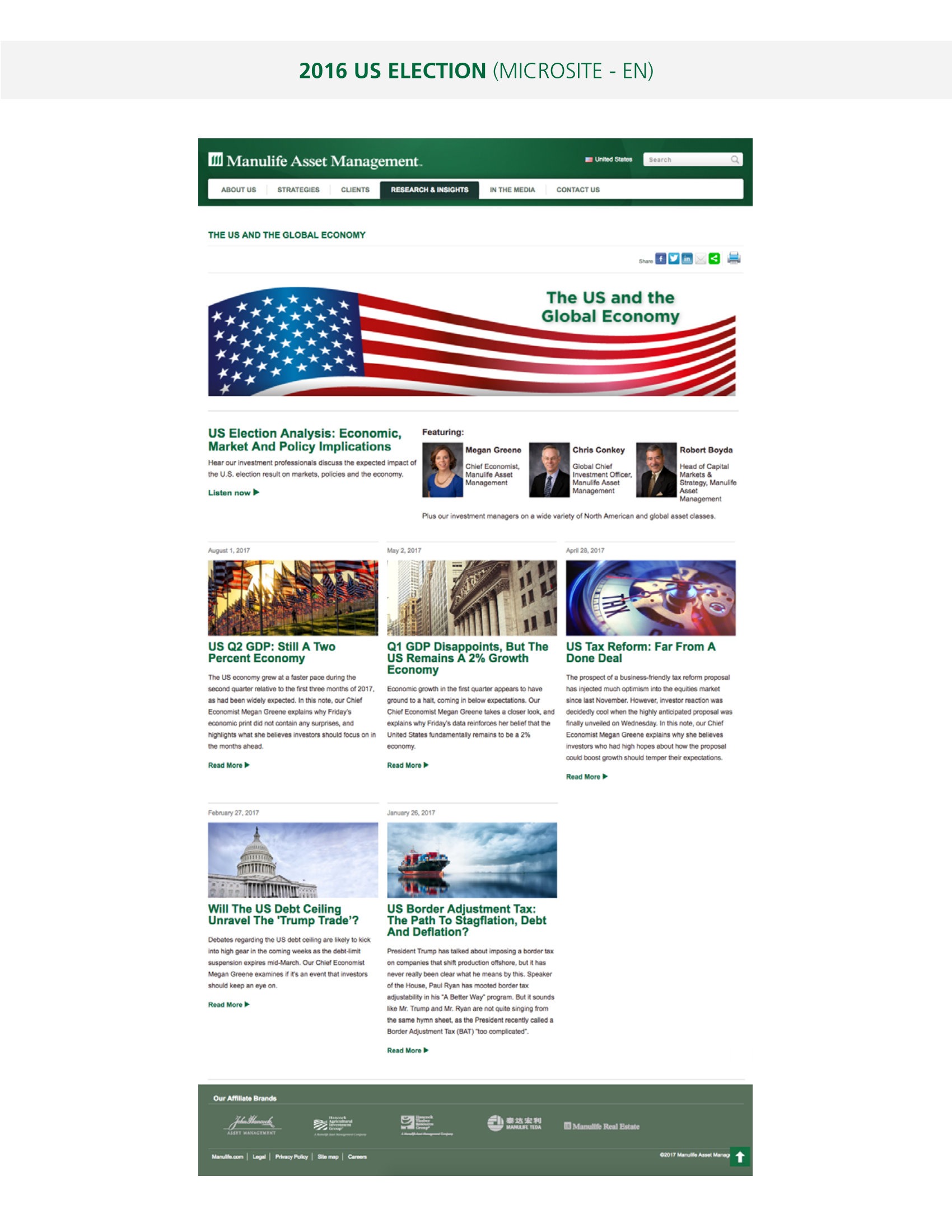 Entry Highlights: View Competition Class Performance | Company Name: | Manulife  | | Company Web Site: | www.manulifeam.com | | Project Name: | "2016 U.S. Election and the Post-Election Economy" | | Competition Category: | Print: Magazine/Newsletter | | Annual Revenue: | $10+ billion | | Employee Base: | 1,000 - 10,000 employees | | Award Garnered: | Platinum | | Top 100 Rank: | 14 | | | | Judging Results | | First Impression: | | | Overall Narrative: | | | Overall Visual Design: | | | Creativity: | | | Message Clarity: | | | Perceived Relevance: | | | Total Score: | |