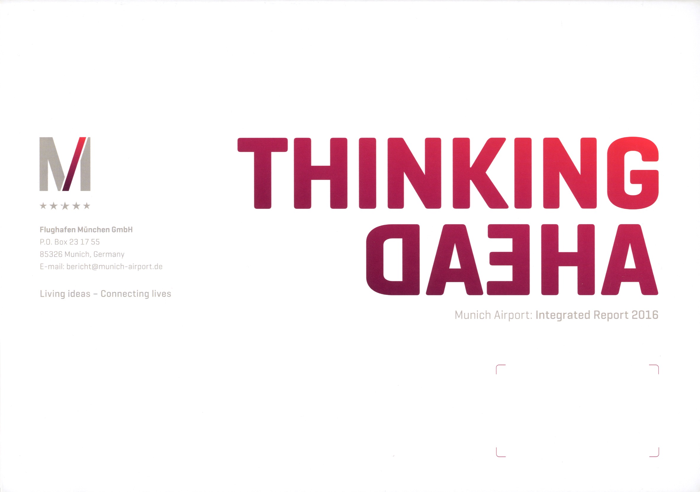 Entry Highlights: View Competition Class Performance | Company/Agency Name: | Flughafen München GmbH  / Kirchhoff Consult AG | | Company/Agency Web Site: | www.munich-airport.de / www.kirchhoff.de | | Project Name: | The Munich Airport Integrated Report 2016 | | Competition Category: | Print: Integrated Report | | Annual Revenue: | $1 - $10 billion | | Employee Base: | 1,000 - 10,000 employees | | Award Garnered: | Bronze | | Top 100 Rank: | 96 | | | | Judging Results | | First Impression: | | | Overall Narrative: | | | Overall Visual Design: | | | Creativity: | | | Message Clarity: | | | Perceived Relevance: | | | Total Score: | |
