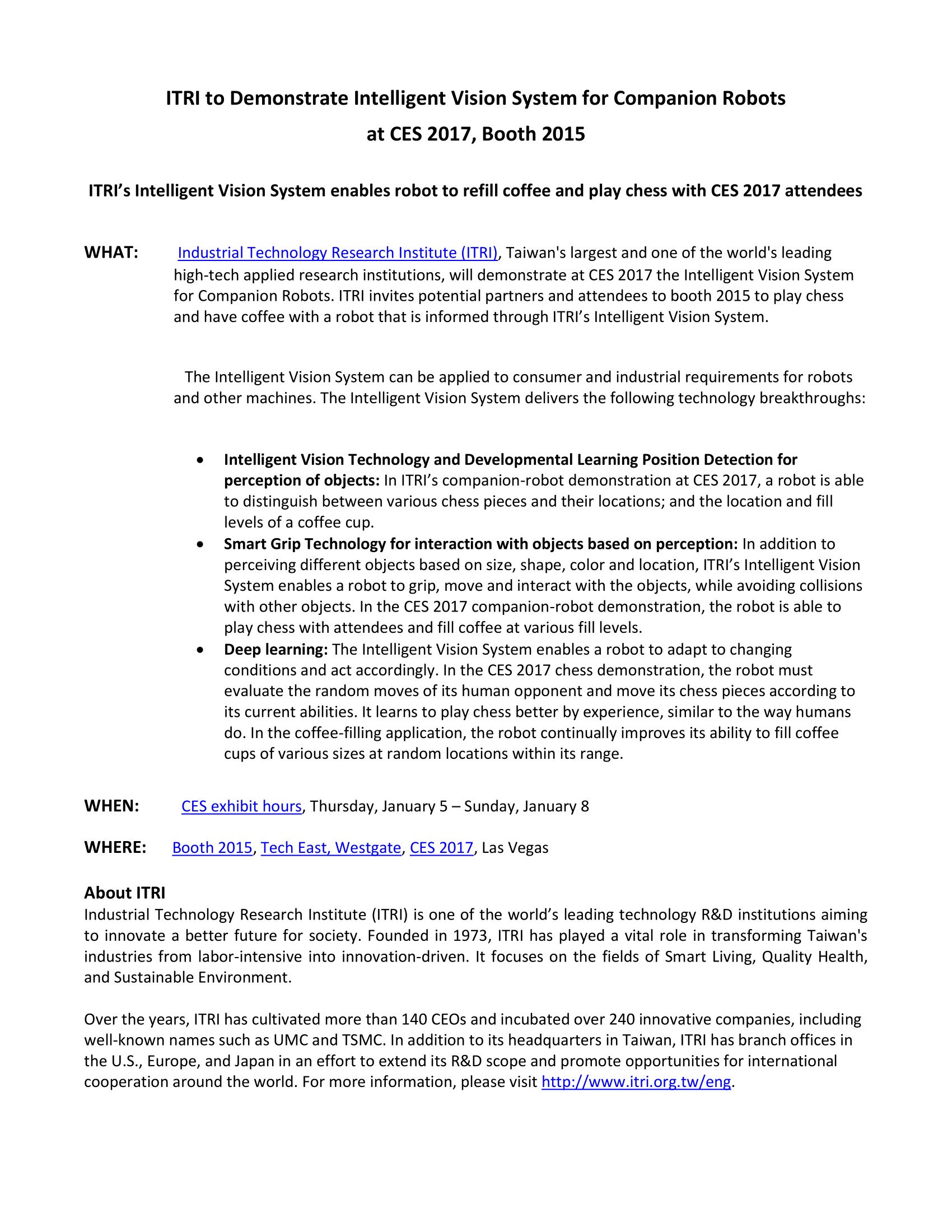 Entry Highlights: View Competition Class Performance | Company/Agency Name: | Industrial Technology Research Institute  / Graham & Associates, Inc. | | Company/Agency Web Site: | www.itri.org / www.graham-associates.com | | Project Name: | "ITRI Intelligent Vision System for Companion Robots at CES 2017" | | Competition Category: | Print: Press/Media Kit | | Annual Revenue: | $10 - $100 million | | Employee Base: | 1,000 - 10,000 employees | | Award Garnered: | Gold | | Top 100 Rank: | 35 | | | | Judging Results | | First Impression: | | | Overall Narrative: | | | Overall Visual Design: | | | Creativity: | | | Message Clarity: | | | Perceived Relevance: | | | Total Score: | |