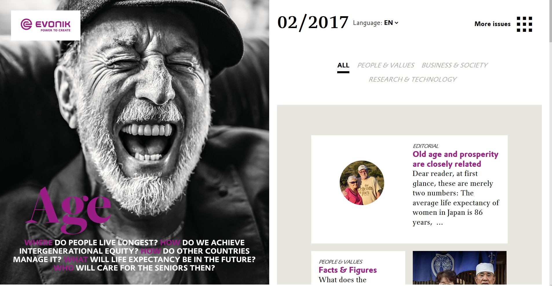 Entry Highlights: View Competition Class Performance | Company/Agency Name: | Evonik Industries AG  / BISSINGER [+] | | Company/Agency Web Site: | www.evonik.com / www.bissingerplus.de | | Project Name: | "Evonik Magazine" | | Competition Category: | Digital: Newsletter/Magazine | | Annual Revenue: | $10+ billion | | Employee Base: | 10,000+ employees | | Award Garnered: | Silver | | Top 100 Rank: | 85 | | | | Judging Results | | First Impression: | | | Overall Narrative: | | | Overall Visual Design: | | | Creativity: | | | Message Clarity: | | | Perceived Relevance: | | | Total Score: | |