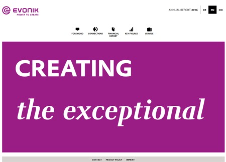 Entry Highlights: View Competition Class Performance | Company/Agency Name: | Evonik Industries AG  / BISSINGER [+] | | Company/Agency Web Site: | www.evonik.com / www.bissingerplus.de | | Project Name: | "Creating the Exceptional" | | Competition Category: | Digital: Newsletter/Magazine | | Annual Revenue: | $10+ billion | | Employee Base: | 10,000+ employees | | Award Garnered: | Bronze | | | | Judging Results | | First Impression: | | | Overall Narrative: | | | Overall Visual Design: | | | Creativity: | | | Message Clarity: | | | Perceived Relevance: | | | Total Score: | |