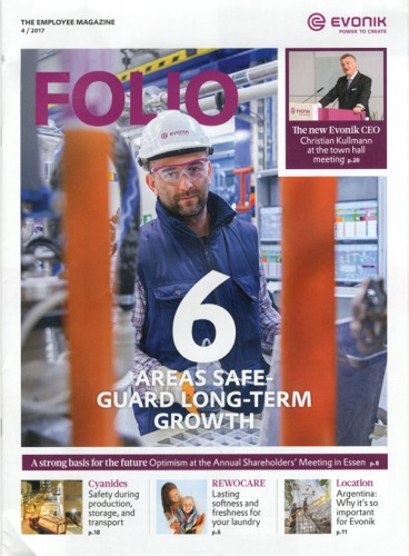 Entry Highlights: View Competition Class Performance | Company/Agency Name: | Evonik Industries AG  / BISSINGER [+] | | Company/Agency Web Site: | www.evonik.com / www.bissingerplus.de | | Project Name: | "Folio" | | Competition Category: | Print: Magazine/Newsletter | | Annual Revenue: | $10+ billion | | Employee Base: | 10,000+ employees | | Award Garnered: | Bronze | | | | Judging Results | | First Impression: | | | Overall Narrative: | | | Overall Visual Design: | | | Creativity: | | | Message Clarity: | | | Perceived Relevance: | | | Total Score: | |