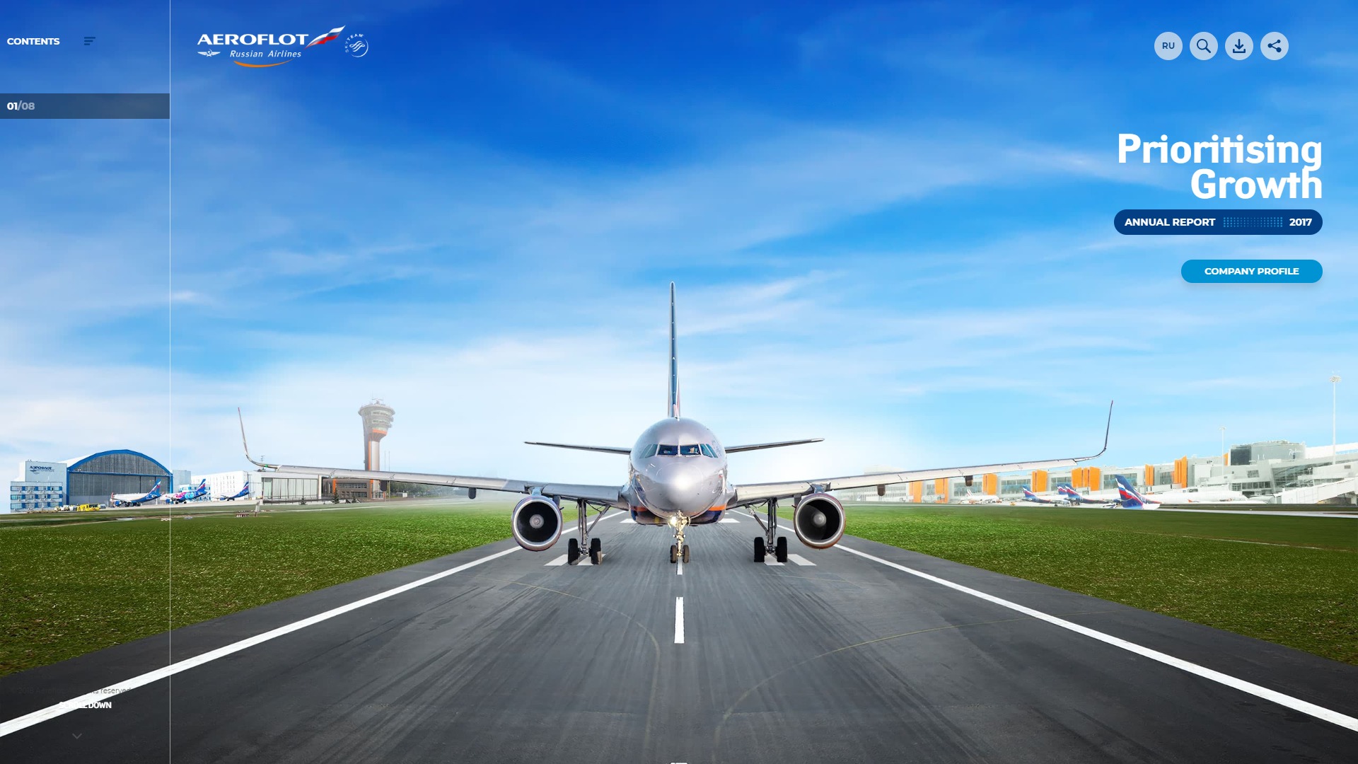 | Company/Agency Name: | Aeroflot / EQS Group | | Company/Agency Web Site: | www.aeroflot.com/ru-en / www.eqs.com/ | | Annual Revenue: | $100 million - $1 billion | | Employee Base: | 1,000 - 10,000 employees | | Core Industry: | Aerospace & Defense | | Type of Report: | Online Report | | Regional Top 80 Rank: | 55 (Europe/Middle East/Africa Region) | | Country-Based Honors: | Top 20 Russian Reports | | Industry Award Garnered: | Gold | | | | Judging Results | | First Impression: | | | Report Cover: | | | Letter to Shareholders: | | | Report Narrative: | | | Report Financials: | | | Creativity: | | | Message Clarity: | | | Information Accessibility: | | | Total Score: | |