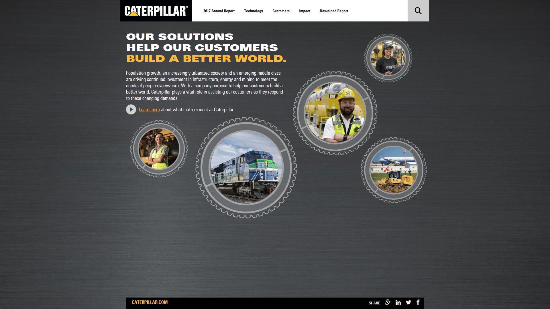 | Company/Agency Name: | Caterpillar Inc. / Corporate Reports Inc | | Company/Agency Web Site: | www.caterpillar.com/ / cricommunications.com/ | | Annual Revenue: | $10+ billion | | Employee Base: | 10,000+ Employees | | Core Industry: | Equipment, Machinery & Instruments | | Type of Report: | Online Report | | Title/Theme: | Caterpillar 2017 Annual Report Interactive | | Regional Top 80 Rank: | 12 (Americas Region) | | Country-Based Honors: | Top 60 American Reports | | Industry Award Garnered: | Platinum | | Top 100 Worldwide Rank: | 51 | | | | Judging Results | | First Impression: | | | Report Cover: | | | Letter to Shareholders: | | | Report Narrative: | | | Report Financials: | | | Creativity: | | | Message Clarity: | | | Information Accessibility: | | | Total Score: | |
