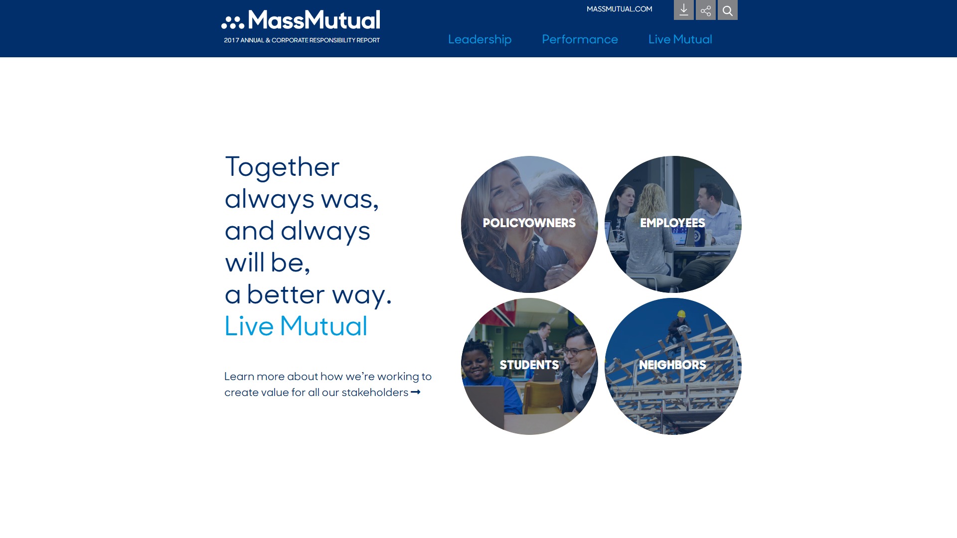 | Company/Agency Name: | Massachusetts Mutual Life Insurance Company / Corporate Reports Inc | | Company/Agency Web Site: | www.massmutual.com/ / cricommunications.com/ | | Annual Revenue: | $10+ billion | | Employee Base: | 1,000 - 10,000 Employees | | Core Industry: | Insurance | | Type of Report: | Online Report | | Title/Theme: | MassMutual 2017 Annual and CRR Report Interactive | | Regional Top 80 Rank: | 65 (Americas Region) | | Country-Based Honors: | Top 60 American Reports | | Industry Award Garnered: | Gold | | | | Judging Results | | First Impression: | | | Report Cover: | | | Letter to Shareholders: | | | Report Narrative: | | | Report Financials: | | | Creativity: | | | Message Clarity: | | | Information Accessibility: | | | Total Score: | |