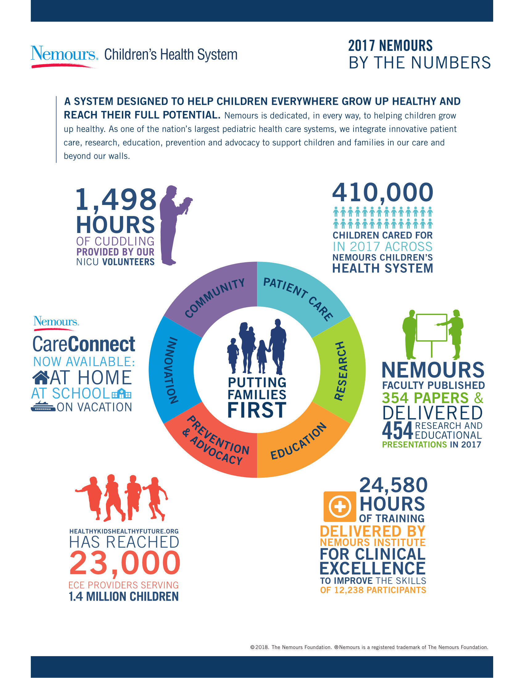 | Company/Agency Name: | Nemours Children's Health System / ruckus. advertising + public relations | | Company/Agency Web Site: | www.nemours.org / www.createaruckus.com | | Annual Revenue: | $1 - $10 billion | | Employee Base: | 1,000 - 10,000 employees | | Core Industry: | Health Care — Providers & Services | | Type of Report: | Other | | Title/Theme: | Infinite Possibilities: 2017 Report To Our Communities | | Industry Award Garnered: | Gold | | | | Judging Results | | First Impression: | | | Report Cover: | | | Letter to Shareholders: | | | Report Narrative: | | | Report Financials: | | | Creativity: | | | Message Clarity: | | | Information Accessibility: | | | Total Score: | |