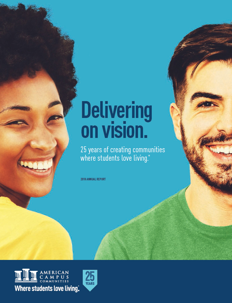 Entry Highlights: View Competition Class Performance | Company/Agency Name: | American Campus Communities  / Big Pivot Partners | | Company/Agency Web Site: | americancampus.com / www.bigpivot.net | | Project Name: | American Campus Communities – Delivering on Vision | | Competition Category: | Report: Annual Report | | Annual Revenue: | $100 million – $1 billion | | Employee Base: | 1,000 – 10,000 employees | | Award Garnered: | Gold | | Top 100 Rank: | 58 | | | | Judging Results | | First Impression: | | | Overall Narrative: | | | Overall Visual Design: | | | Creativity: | | | Message Clarity: | | | Perceived Relevance: | | | Total Score: | |
