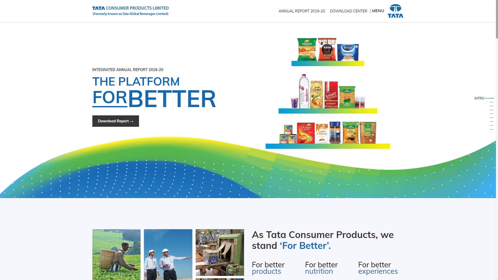 Entry Highlights: View Competition Class Performance | Company Name: | TATA CONSUMER PRODUCTS LIMITED  | | Company Web Site: | tataconsumer.com | | Project Name: | Integrated Annual Report | | Competition Category: | Report: Integrated Report | | Annual Revenue: | $1 – $10 billion | | Employee Base: | 1,000 – 10,000 employees | | Award Garnered: | Silver | | | | Judging Results | | First Impression: | | | Overall Narrative: | | | Overall Visual Design: | | | Creativity: | | | Message Clarity: | | | Perceived Relevance: | | | Total Score: | |