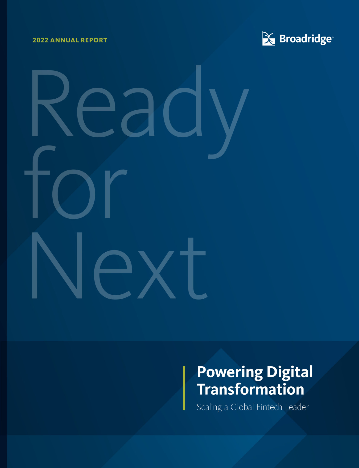 | Company/Agency Name: | Broadridge Financial Solutions / Ideas On Purpose | | Company/Agency Web Site: | www.broadridge.com / www.ideasonpurpose.com | | Annual Revenue: | $1 - $10 billion | | Employee Base: | 1,000 - 10,000 employees | | Core Industry: | Financials - Diversified Services | | Type of Report: | Annual Report | | Title/Theme: | Powering Digital Transformation | | Industry Award Garnered: | Silver | | | | Judging Results | | First Impression: | | | Report Cover: | | | Letter to Shareholders: | | | Report Narrative: | | | Report Financials: | | | Creativity: | | | Message Clarity: | | | Information Accessibility: | | | Total Score: | |