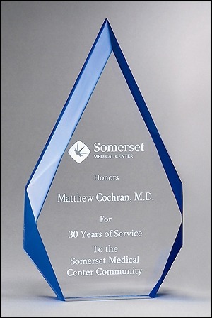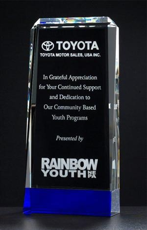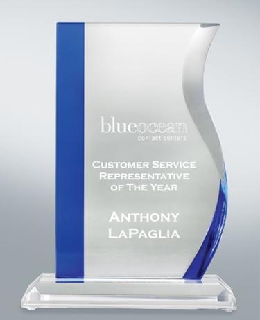 Clear optical crystal with blue side accents. Approximately 9½" tall (24 cm), 6" wide (15 cm) and 3 lb. (1½ kg.) in weight.ORDERING INSTRUCTIONS Unless you specify customization instructions, we'll use our default text wording and layout. View a sample layout. This includes your company and agency (if applicable) names; the award garnered; and contest details. You have the option of receiving complimentary proofs requiring your approval or expediting production by accepting LACP's standard production layout and process. Allow 6-8 weeks for shipment.